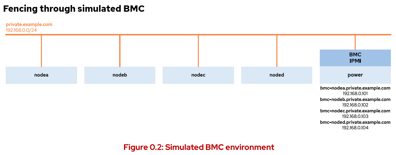 가상머신은 Power 관리에 관련된 BMC(Baseboartd Management Controller) 가 없다. 래서 BMC 동작은 power 라는 machine 의해 시뮬레이트된다. 시뮬레이션된 BMC 메커니즘은 클러스터 노드에서 원격으로 모니터링 및 관리 작업을 수행한다. (BMC에서 펜싱을위한 파워 모니터링을 말하는것으로 보임) BMC 장치의 IP주소는 (192.168.0.101/102/103/104) 이며 각각 nodea/b/c/d 를 위해 사용된다. 이것은 power 에 의해 호스트된다.