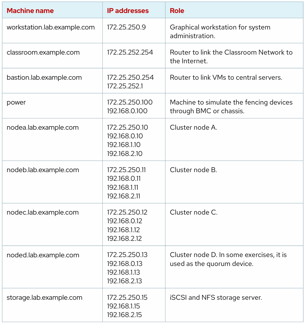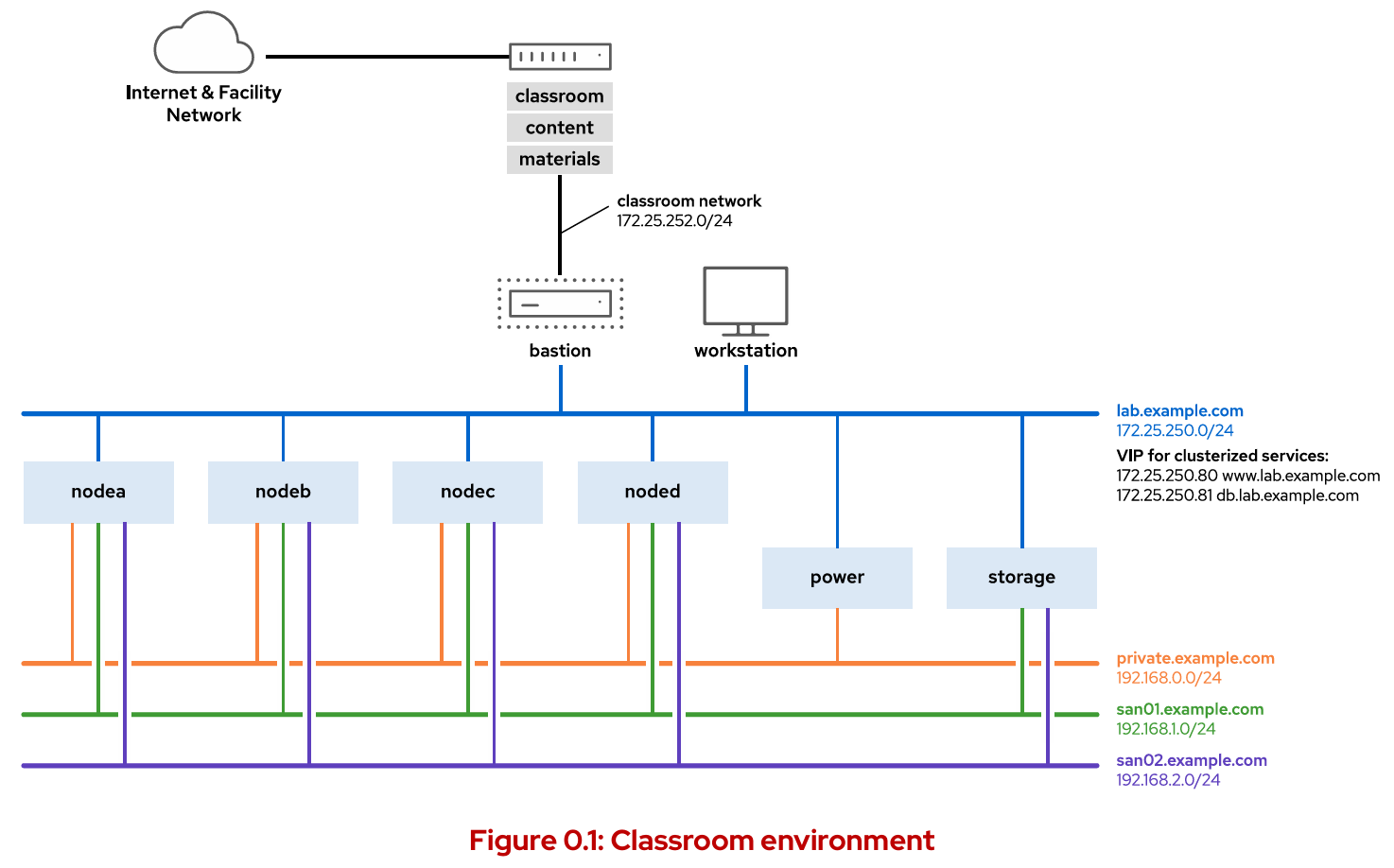 몇몇 서버들은 support service를 하는 시스템이 classroom에 있다. content.example.com / materials.example.com 이 둘은 핸즈온 활동에서 사용되는 소프트웨어와 material이 있다. (이부분은 실제 공부에서는 중요하지 않다) 또한 iSCSI와 NFS를 제공하는 스토리지 서버인 storage.lab.example.com 도 제공된다. 이 스토리지는 매우 중요하지만 실습을 위해 구축하는 방법은 따로 이 수업에서 제공되지 않는다.