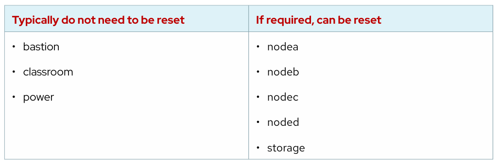 일부 클래스룸의 VM들은 작업동안 수정되지 않으며, 시스템 문제가 발생하지 않는 한 전혀 리셋할 필요도 없다. 예를 들어, workstation 머신은 불안정해지거나 통신이 끊긴 경우에만 재설정해야 하며 자체적으로 재설정될 수 있다. 아래 표에는 재설정할 수 없는 머신과 필요한 경우 재설정할 수 있는 머신이 나열되어 있다. 만약 재설정을 해야하는 상황이 있다면, 온라인 환경에서, 선택한 머신을 클릭하고 ACTION -> RESET을 하면 된다.