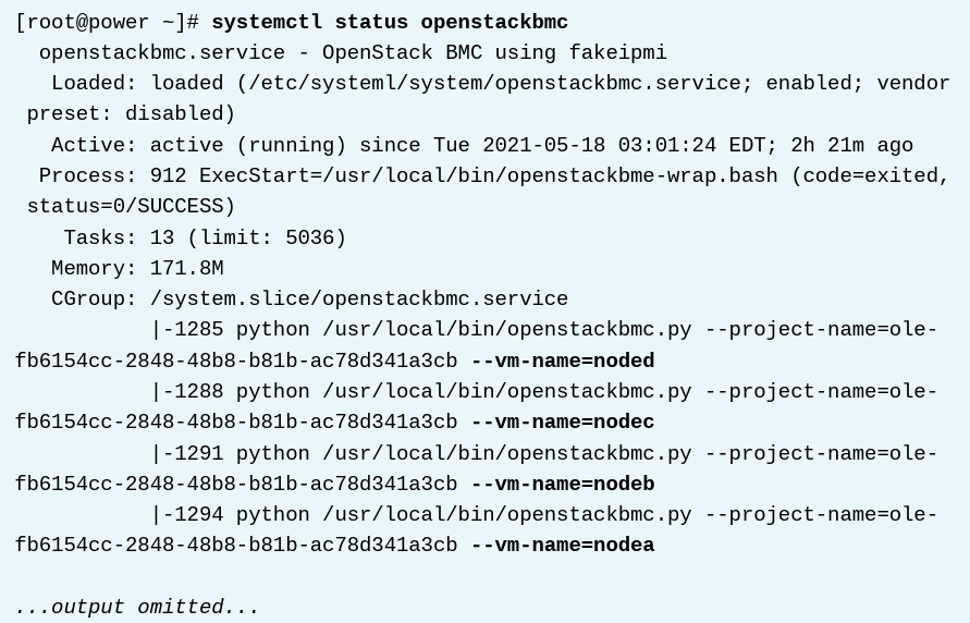 BMC IP주소와 노드 이름은 classroom 환경이 생성될 때 할당된다. openstackbmc 서비스는 power 에서 power-managed cluster node 하나당 하나의 프로세스로 실행된다. (즉 4개의 프로세스가있음) 이 서비스는 해당 노드를 대신하여 IPMI (Intelligent Platform Management Interface)의 요청에 응답한다. 모든 BMC 장치에 대하여, 로그인 정보는 admin / password 이다.