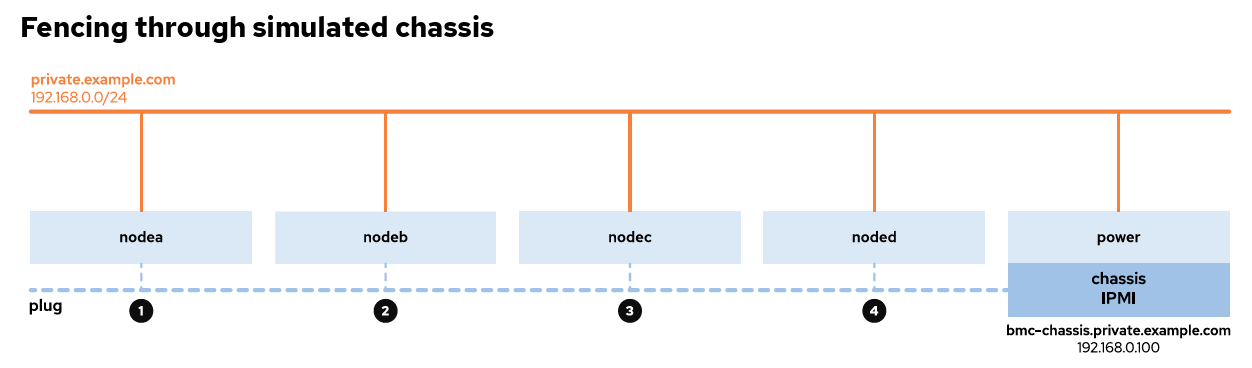 이 fencing 방법은 각 클러스터 노드에 플러그 번호를 할당하는데 fence_rh436 커스텀 스크립트와 pcmk_host_map 파라미터를 사용한다. 노드를 펜스하라는 요청이 chassis IP (192.168.0.100)에 보내질 때, 플러그 번호가 포함된다. fence_rh436 스크립트는 이 요청을 Fencing through simulated BMC 방법 에게 IPMI call 로 변환시켜 보낸다.