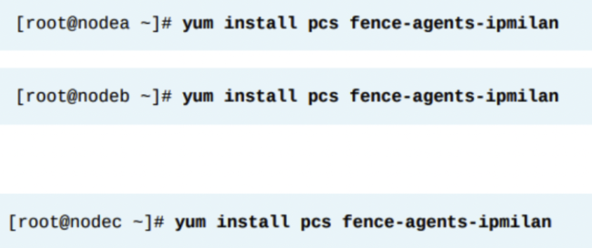 클래스룸 환경은 서버를 IPMI OVER LAN을 통해 전원끄기/켜기/재시작 할 수 있는 BMC를 포함한다. 클러스터에서 BMC를 사용하기 위해서는 fence-agents-ipmilan 패키지를 모든 클러스터 노드에 설치해야 한다.