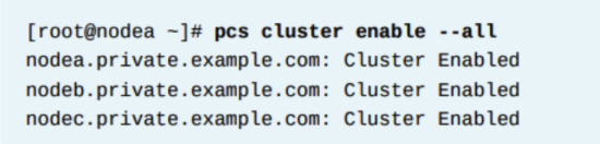 디폴트로, 리부팅된 클러스터 노드는 자동으로 크러스터에 rejoin 되지 않는다. pcs cluster enable 명령을 써서, 클러스터 서비스가 자동으로 실행되게 한다. --all 옵션은 모든 클러스터 멤버가 클러스터 서비스를 자동으로 실행되게 한다.