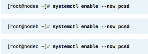 pcsd 서비스는 클러스터 구성 동기화와 클러스터 구성을 위한 웹 프론트엔드를 제공한다. 이 서비스는 모든 클러스터 노드에 있어야 한다. systemctl을 사용하여 pcsd를 활성화한다. 모든 클러스터 노드에서 한다.