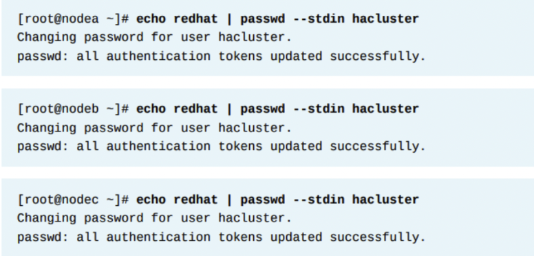 pcsd는 클러스터 커뮤니케이션과 구성을 위해 hacluster라는 유저를 사용한다. 레드햇은 클러스터 내의 모든 노드의 hacluster 유저가 동일한 비번을 쓰기를 권고한다. 아래처럼 비번을 redhat으로 구성할 수 있다.
