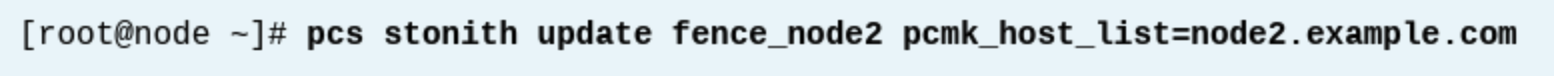 pcs stonith update fence_device_이름 : fencing device의 옵션을 변경할 수 있다. 이 명령은 새로운 fencing device 옵션을 추가하거나, 원래 있는 값을 변경할 수 있다. 예를들어, fencing device 인 fence_node2가 node2 대신 node1를 펜스해버렸다. 이경우, 아래 명령으로 바로잡을 수 있다.