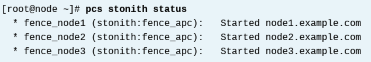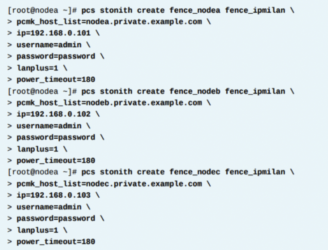 이 예시에서는 fence_ipmilan 이라는 에이전트를 예시로 들며, 각각 노드마다 fence 장치를 생성해야 한다. 따라서 총 3개를 만든다. pcs stonith create 명령을 사용한다. 이 커맨드는 클러스터 노드를 fence할 수 있는 fence agent에 의해 요구되는 파라미터의 세트와 value값을 요구한다. fence agent 인 fence_ipmilan 의 파라미터는 pcmk_host_list, username, password, ip가 요구된다. pcmk_host_list 파라미터는 클러스터에 알려진 해당 호스트를 나열한다. ip 매개변수는 펜싱 장치의 IP 주소 또는 호스트 이름을 요구한다.
