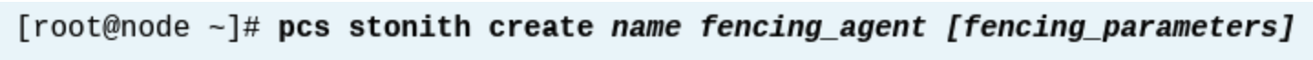 클러스터에서, pcs stonith create 명령으로 Fence Device를 생성할 수 있다. 기본 형식은 다음과 같다.