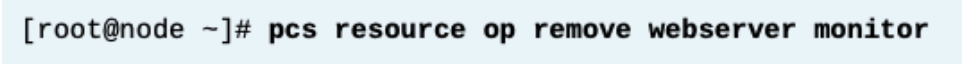 pcs resource op remove 명령으로 제거할 수 있다. 아래처럼 webserver 리소스에서 op 값을 제거한다.