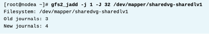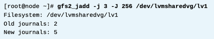 위 결과는 GFS2 파일 시스템에 저널이 3개만 있다는 것을 보여준다. 따라서 네 번째 노드에 해당 파일 시스템을 마운트하려는 경우 추가 저널을 추가해야 한다.
