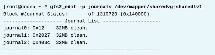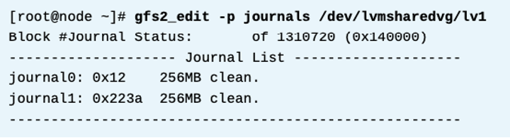 파일시스템이 가진 저널보다 더 많은 노드에 gfs2 파일시스템을 마운트할 수 없다. 파일시스템이 얼마나 많은 저널을 가지고 있는지 찾기 위해, gfs2_edit -p journals 명령을 사용한다. 아래 예시대로는 2개의 저널을 가지고 있는것을 알수 있다.