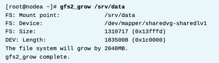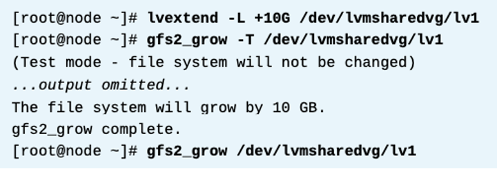 gfs2_grow 명령을 써서 gfs2 파일시스템을 확장할 수 있다. 파일시스템 장치명이나 마운트포인트를 명시한다. 명령은 이 파일시스템이 마운트되어있는곳 아무데서나 할 수 있다. 아래 예시는 10GiB 로지컬 볼륨을 추가하고, gfs2_grow 로 테스트하고, 실제로 작업한다.