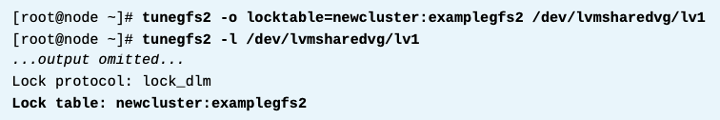 gfs2 파일시스템을 다른 클러스터로 옮기거나, 클러스터 이름을 바꾸는경우, 꼭 해당 gfs2 슈퍼블록안에있는 locking table name을 업데이트 해줘야 한다. 또한, gfs2 슈퍼블록에 변경을 가하기 전에, 파일시스템을 모든 클러스터 노드에서 umount 해야한다.