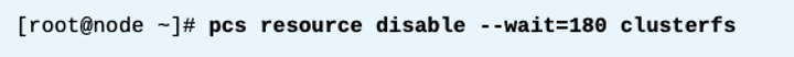 아래 예시는 clusterfs를 disable 한다. --wait 옵션은 명령이 작업이 완료될때까지 기다렸다가 결과를 반환하도록 지시한다. 이 예제에서는 명령이 최대 180초 동안 대기한 다음 해당 타이머가 만료(작업이 제대로 안끝나면) 오류를 반환한다.