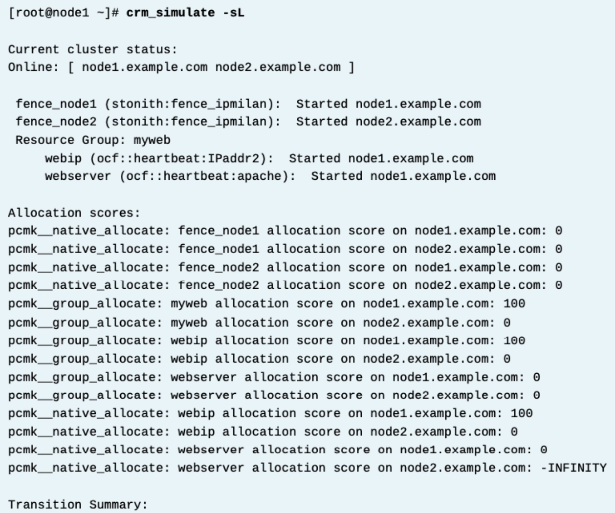 클러스터가 노드1에서 webip 리소스를 시작했다. 리소스가 실행되고 있을 때, 리소스 그룹이 자동으로 클러스터 내 모든 노드에 대하여 webserver 의 리소스가 -infinity 가 되도록 세팅했다. 따라서 그 리소스는 node1에서 실행되어야만 했다. (리소스그룹안에 모든 리소스들은 동일한 클러스터 노드에서 실행되어야만 하므로)