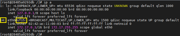 28485a9293db : CentOS 컨테이너, 14번 항목의 eth0@if15 를 가진다.
