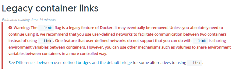 컨테이너끼리 연동을 하려면 IP 기반의 설정은 좋지 않으며, link 옵션을 사용하여 연동해야 한다. 즉 docker container run 할 때 --link 옵션을 지정하야 한다. --link 옵션을 지정한다는 것은 컨테이너 안에 있는 /etc/hosts 파일에 컨테이너명과 컨테이너에 할당된 IP가 등록되고 이를 통해 통신이 가능하게 된다. link를 하지 않으면 당연히 그 정보는 없다. link가 걸린상태에서 컨테이너가 재기동하면 IP가 바뀔 수 있는데, 바뀐 IP값이 자동으로 /etc/hosts에 등록되어서 container의 ip정보가 바뀌어도 서로간 문제없이 통신이 가능하다.