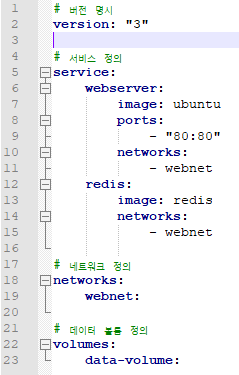 총 3개의 요소로 구성된다. 관리하고싶은서비스 (services:) , 네트워크 (networks:) , 볼륨(volumes:) 각 요소의 밑에 추가 상세 설정을 넣을 수 있다. 각 3개의 요소는 모두 명시하지 않아도 된다.