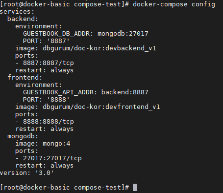 compose의 구성 확인. yml을 열어보는것과 동일하다.