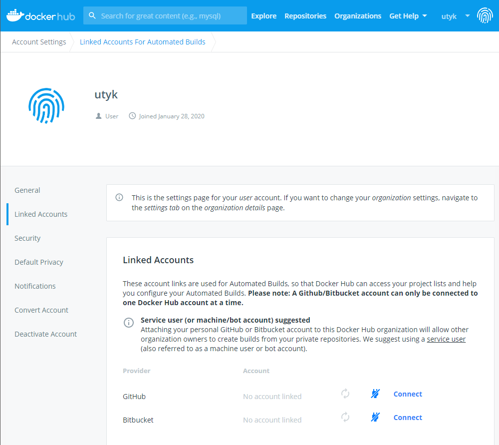 github 레포지토리에 자신이 만든 도커파일 스크립트를 올리면, 도커허브에 연동하여 자동으로 이미지를 빌드하고, 결과를 도커허브에 저장할 수 있다. github 뿐만 아니라 Bitbucket도 가능한데, 여기서는 다루지 않는다. 먼저, 아래 두 사이트의 계정을 생성한다.