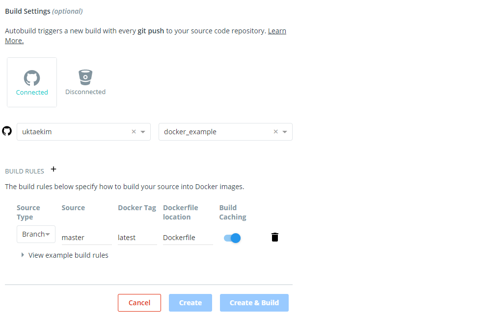 아래 Build Settings에서, Connected 되어 있는 github를 누르면, 자신의 아이디와, 레포지토리를 선택할 수 있다. 위에서 생성한 docker_example 레포지토리를 선택하자.