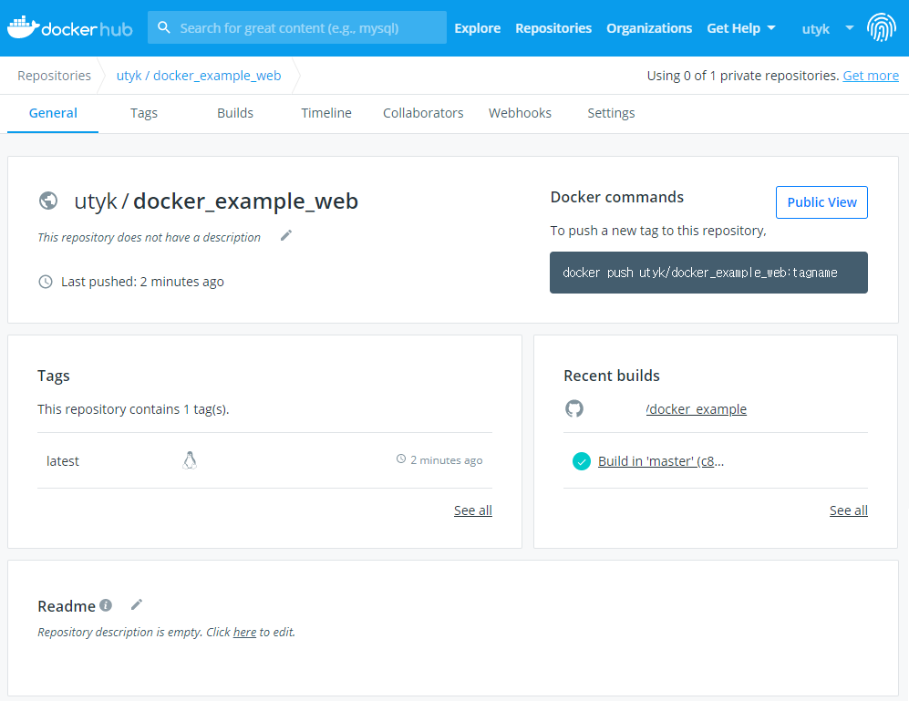 이제 다시 내 도커허브의 레포지토리에 가면, 만든 이미지가 생성된 것을 확인할 수 있다. 해당 이미지를 push로 다운받을 수 있게 아래 명령어도 친절하게 적혀있다.