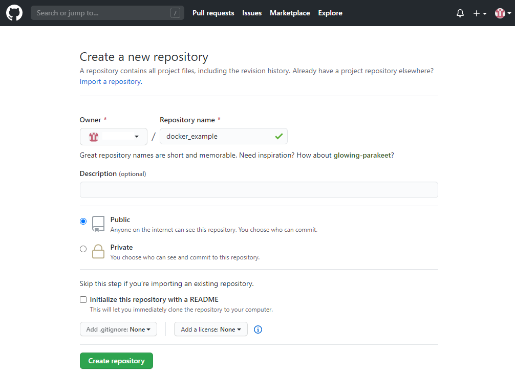 아래와 같이 Repository 생성 화면이 나온다. 이름은 자유롭게 하고, 그 외에는 건드릴 필요 없다.
