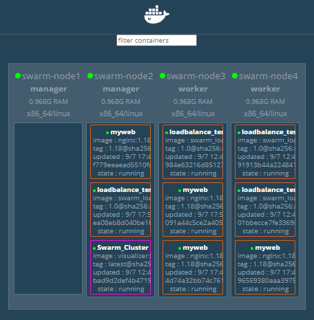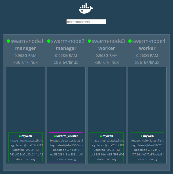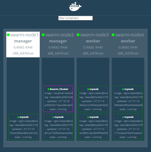 생성하면, 아래와 같이 2개의 myweb이라는 서비스의 컨테이너 2개가 여러 노드에 걸쳐 생성된다.