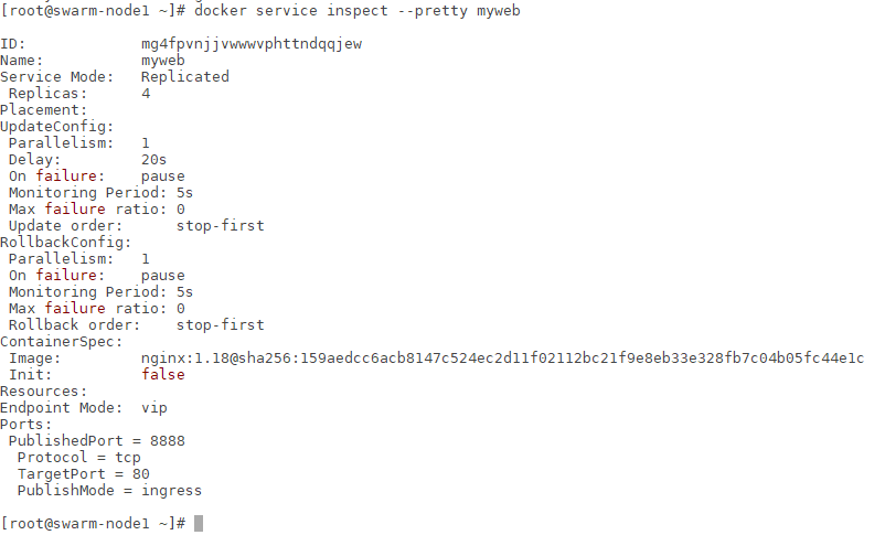 docker service create --name myweb --replicas 4 --update-delay 20s -p 8888:80 nginx:1.18