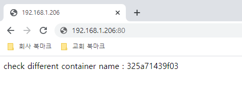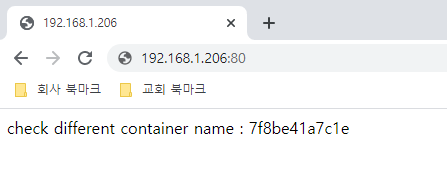 아래와 같이 브라우저에서 각 노드에 대한 아이피와 포트번호 80으로 접속한 후, 새로고침을 여러번 누르면 랜덤하게 컨테이너 ID가 바뀌는 것을 확인할 수 있다. 계속 F5를 연타해보자.