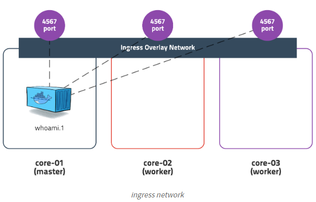 위 예시에서 보면 whoami 서비스로 4567포트를 오픈한다면 3 노드 모두 4567 포트가 오픈된다. 외부에서 해당 서비스에 접속할 때, 어떤 노드를 통해서 접속하든 5개의 컨테이너 중 하나로 분산처리된다.