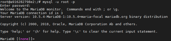 이 폼은 위 공식 도커허브에 나오는 폼의 변형이다. mariadb에 접속할 루트 비밀번호는 직접 설정해야 한다. 또한 외부에서 연결하는 것은 고려하지 않았으므로 딱히 포트를 오픈하지는 않는다. 컨테이너가 생성되었으면, 다음과 같이 해당 컨테이너에 접속해본다.