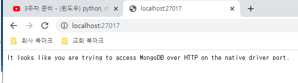 localhost:27017 쳐서 다음과 같이 나오면 잘 실행되고 있다는 것임
