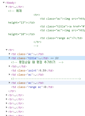 music_lists = soupped_data.select('#body-content > div.newest-list > div > table > tbody > tr')