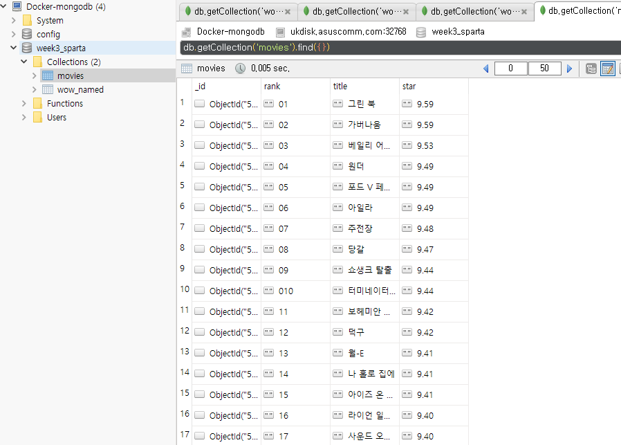 크롤링으로 RANK, TITLE, START 3개의 값을 가져오며 doc 변수에 {'rank': '변수'} 형식으로 데이터베이스에 값을 삽입한다.