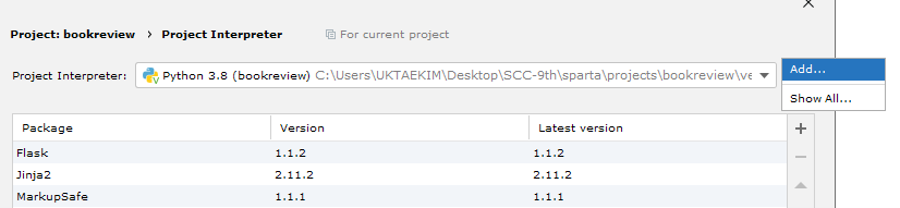 파이참에서, FILE - SETTING -PROJECT INTERPRETER