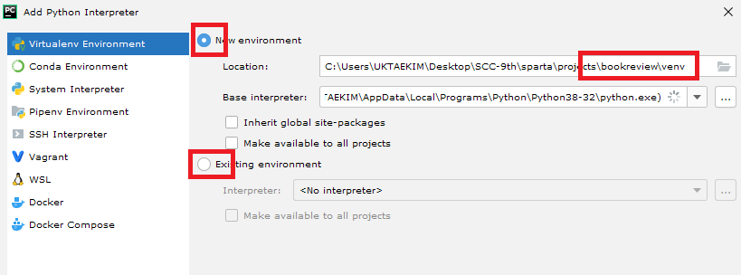 아래와 같은 화면이 나온다. NEW ENVIRONMENT 가 체크되어야 하고, 경로는 내가 만든 경로인 BOOKREVIEW의 venv 가 되어야 한다. venv가 가상으로 환경정보가 저장되는 곳이다.