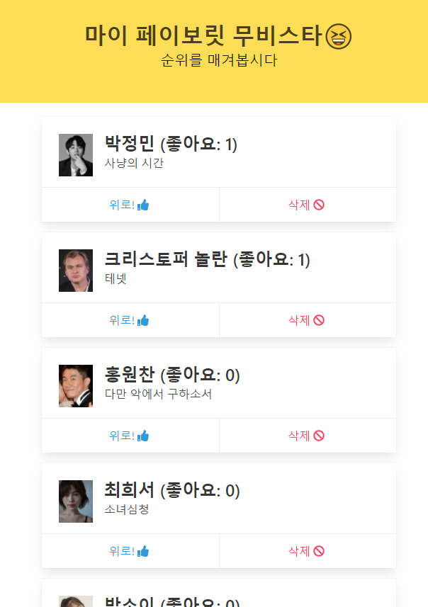 - 좋아요 기능 (update) : 영화인 카드의 "위로" 버튼을 누르면 좋아요 옆 숫자가 추가되고, 좋아요가 많은 순서대로 위에서부터 정렬된다.