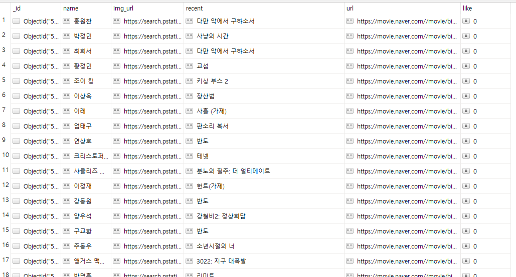 # 출처 url로부터 영화인들의 사진, 이름, 최근작 정보를 가져오고 mystar 콜렉션에 저장합니다.