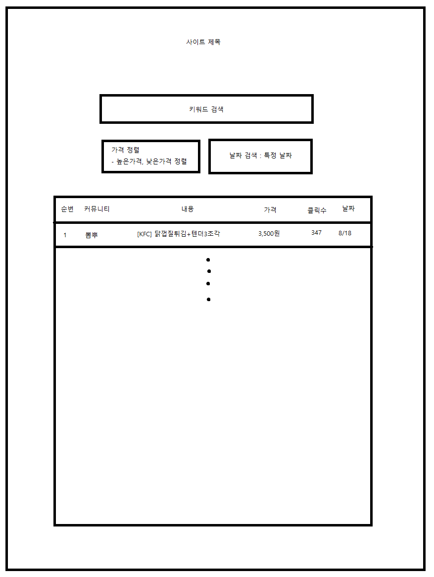 - 데이터 출력은 [제목, 링크, 사이트명, 가격, 시간] 으로 출력한다. 일반 게시판의 형태가 된다.
