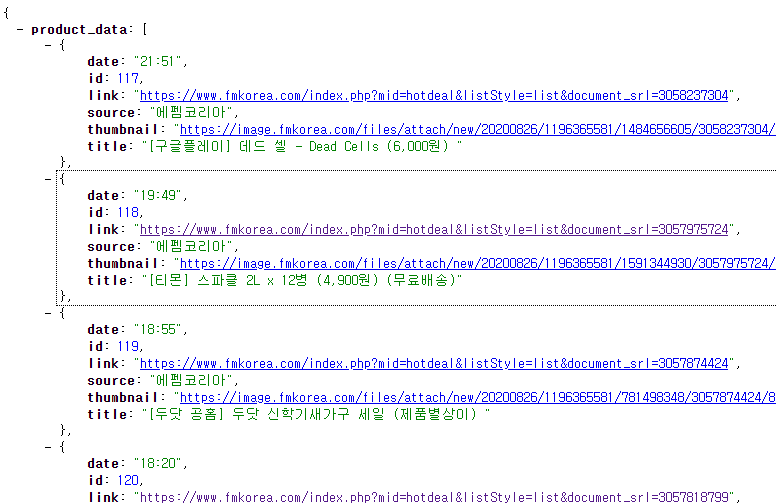 이제 for문으로, datas에 있는 리스트 요소(data)를 1개 (여기에는 id, title, link, date, source, thumbnail 이 있다) 씩 꺼내 0부터 5까지 총 6개의 내용을 가져오고, 그 내용들을 직접 딕셔너리형태로 변환했다. 그리고 그걸 json화 하여 출력한다.