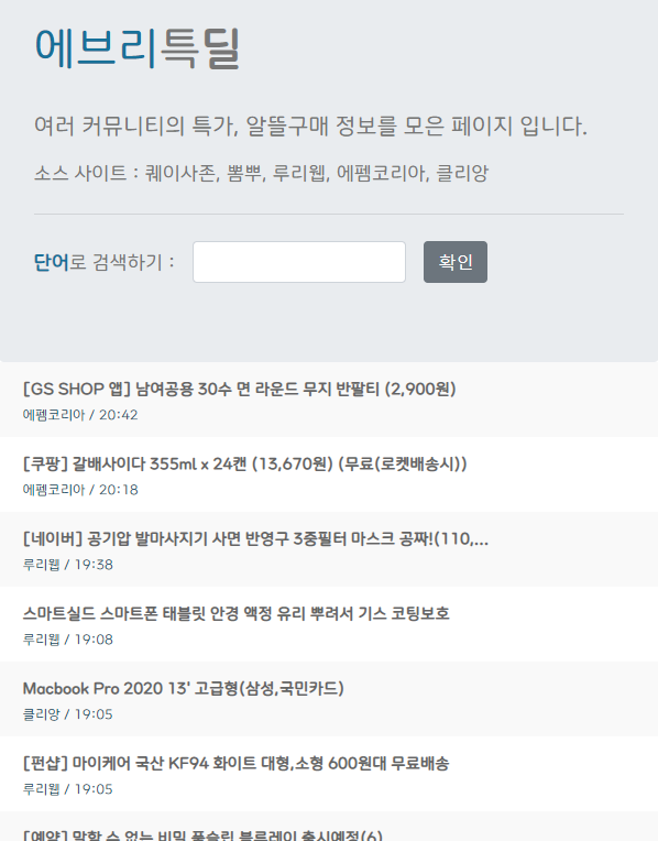 우리나라의 몇몇 상위 커뮤니티에서는 이러한 정보들을 공유하는 게시판이 있는데, 커뮤니티가 많아 일일이 다 들어가서 확인하기가 어렵다. 또한 특가다 보니 금방 종료된다. 그래서 몇몇 커뮤니티를 골라 스크래핑을 통해 한번에 특가 정보를 볼 수 있도록 만들고 싶었다.