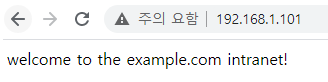 - 관리 호스트의 /var/www/html/index.html 파일이 "welcome to the example.com internet!" 이라는 내용 확인