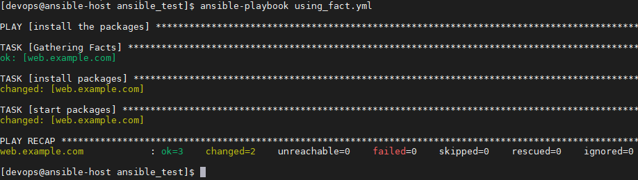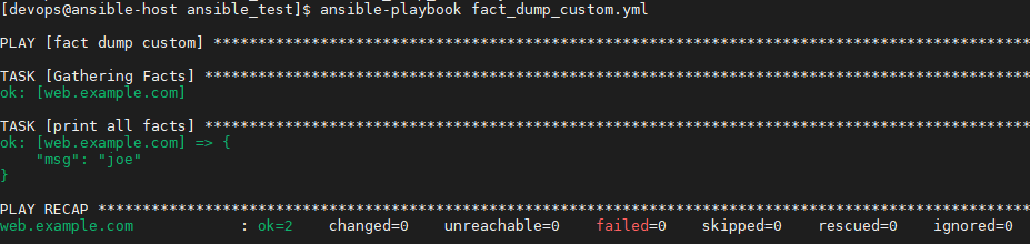 사용자 정의 ansible_facts 변수는, setup 모듈에 의해 ansible_facts 이하의 ansible_local이라는 변수에 저장된다. 그 아래는 팩트를 정의한 파일명에 따라 구성된다. 다음과 같은 방식으로 변수를 참조하게 될 것이다. 이렇게 facts에 사용자 정의 값을 넣었으면, 일반 facts 변수 사용하듯이 사용할 수 있다.