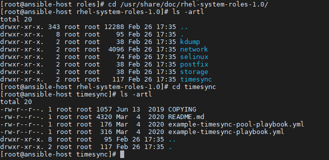 해당 문서는 "/usr/share/doc/rhel-system-roles-버전" 경로에서 확인할 수 있다. 각 role 에 대한 디렉토리가 있으며 README 파일, 그리고 예제파일 등이 있으므로 참고할 수 있다.