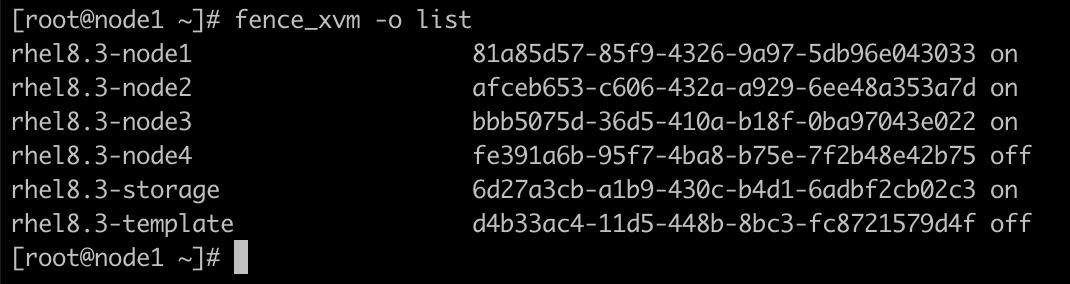 | 가상머신 전체 리스트 확인 | virsh list --all | [root@workstation ~]# virsh list --all Id Name State ----------------------------------- - rhel8.3-node1 shut off - rhel8.3-node2 shut off - rhel8.3-node3 shut off - rhel8.3-node4 shut off - rhel8.3-storage shut off - rhel8.3-template shut off |