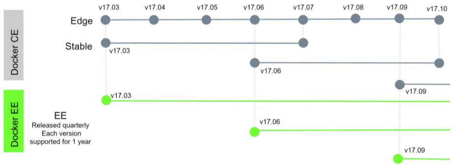 - 에디션에 따라 정기적으로 릴리즈가 있다. - 버전 번호는 연도2자리, 월2자리로 나타난다. 2017년 3월에 릴리즈된 버전은 17.03이 된다. - 도커CE는 매월 보안 지원과 버그 수정 지원인 EDGE의 릴리즈, 4분기별로 안정판인 STABLE이 릴리즈된다. - 도커EE도 CE의 STABLE과 똑같은 시기에 릴리즈된다.